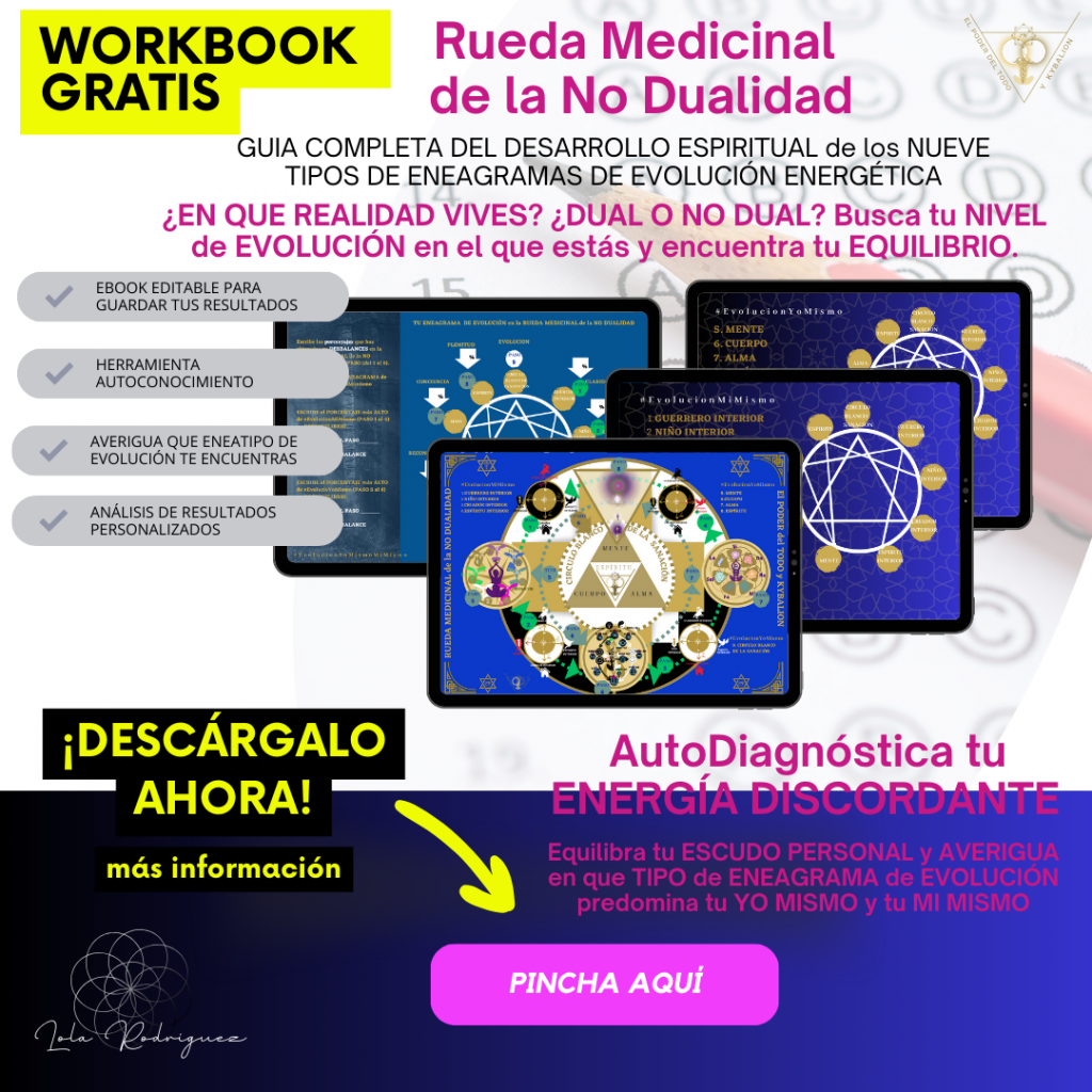 Averigua en que realidad te encuentras con el ANÁLISIS y DIÁGNOSTICO de tu ENERGÍA DISCORDANTE que te impide encontrar el equilibrio que necesitas en tu vida. Con la RUEDA MEDICINAL de la NO DUALIDAD es el autodiagnóstico PREVIO para comenzar a balancear y sanar desde este momento. Descarga GRATIS el WORBOOK con TEST Y TABLA DE RESULTADOS de los 9 niveles de EVOLUCIÓN que he elegido como previo INICIO a la transformación, evolución y sanación del PODER DEL TODO Y KYBALION. Aquí comienza el autoconocimiento y autosanación de tu SER.